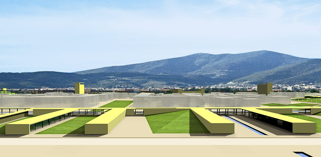 Progetto/ Il progetto si pone come elemento di relazione tra le colline, i limiti dell'edificato di Sesto Fiorentino ed il grande vuoto del Parco Metropolitano. Si esplora la possibilità d'interazione tra elementi naturali ed artificiali, trattando il suolo come un oggetto architettonico, da modellare alla stregua degli edifici che sorregge.