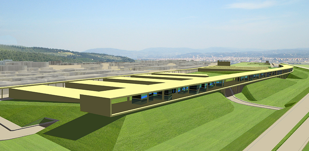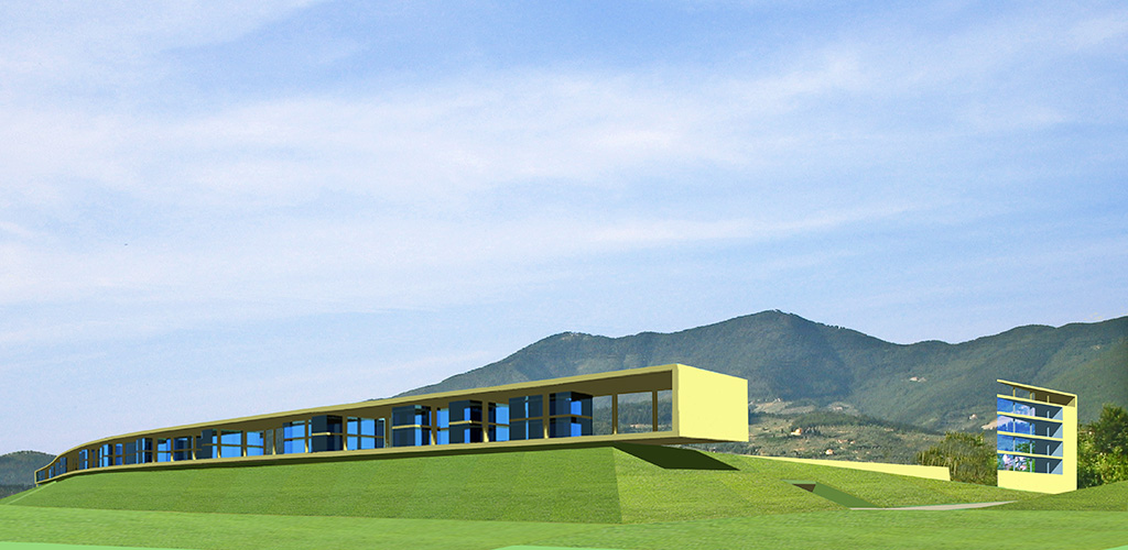 Progetto/ Il progetto si pone come elemento di relazione tra le colline, i limiti dell'edificato di Sesto Fiorentino ed il grande vuoto del Parco Metropolitano. Si esplora la possibilità d'interazione tra elementi naturali ed artificiali, trattando il suolo come un oggetto architettonico, da modellare alla stregua degli edifici che sorregge.