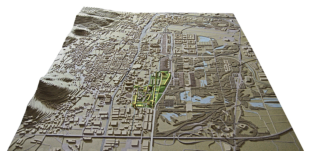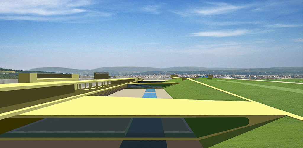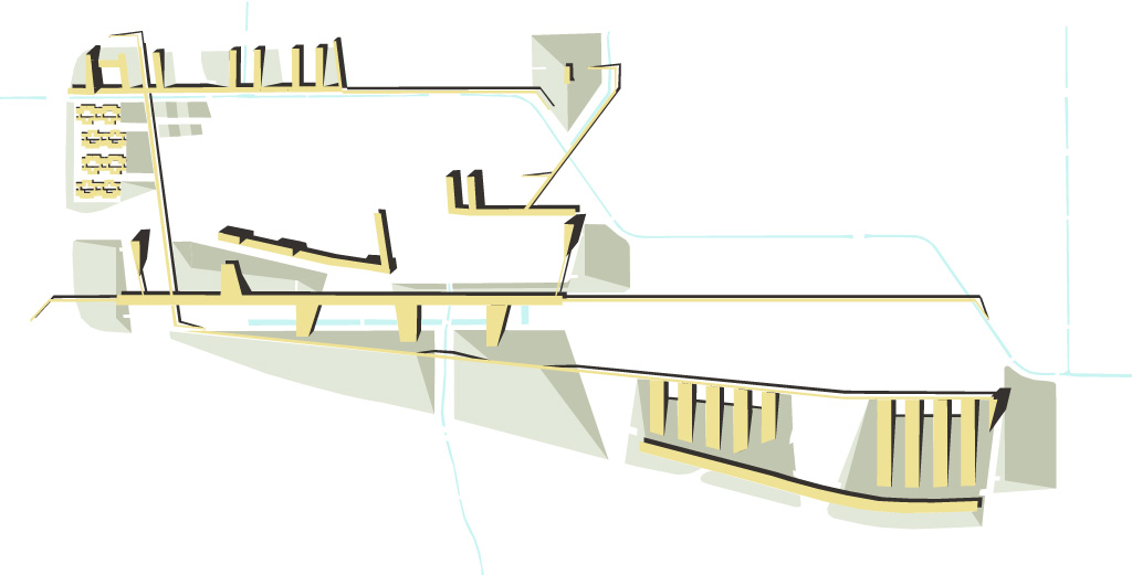 Il fronte parco è risolto con due segni a scala territoriale - lunghi 710 metri, quanto un lato della centuriazione - che incorporano colline artificiali e grandi edifici multifunzionali staccati dal suolo. Le colline sono incise per ricavarne spazi ipogei, mentre i corpi di fabbrica su pilotis, oltre a fornire ampie zone d'ombra, diventano terrazze sospesesull' area metropolitana.