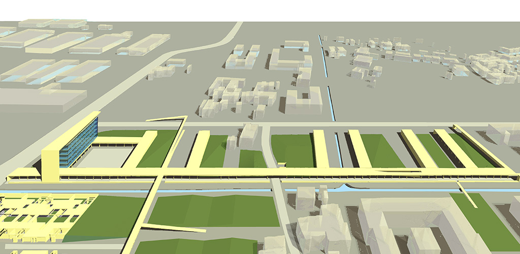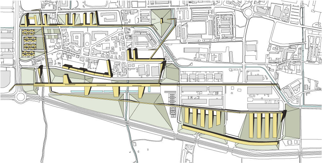 Al livello di campagna il sistema del verde crea la relazione tra nuovo ed esistente, mentre, a quattro metri da terra un percorso ciclo pedonale scavalca le infrastrutture esistenti.