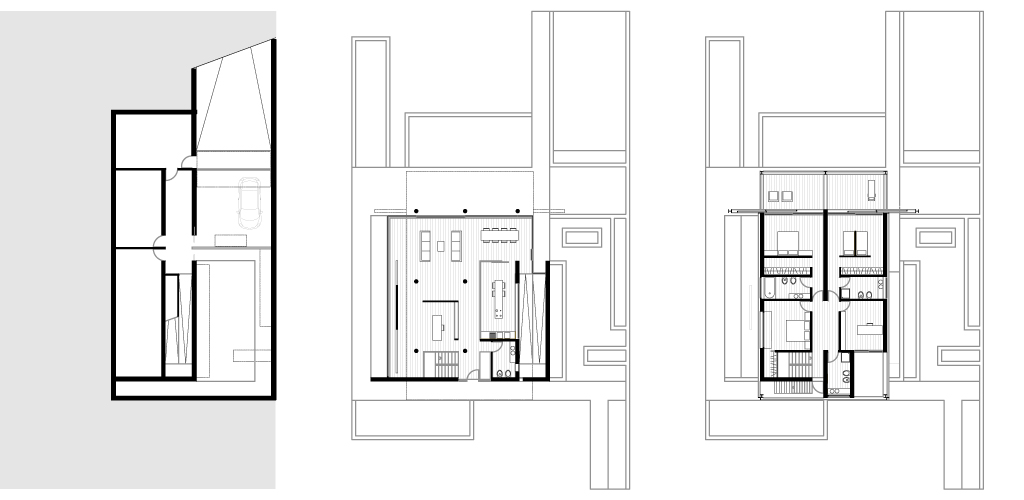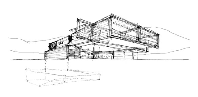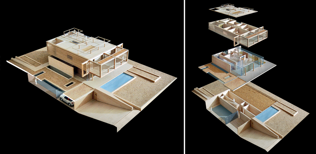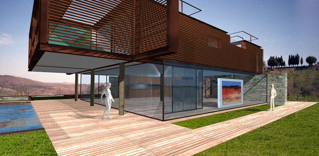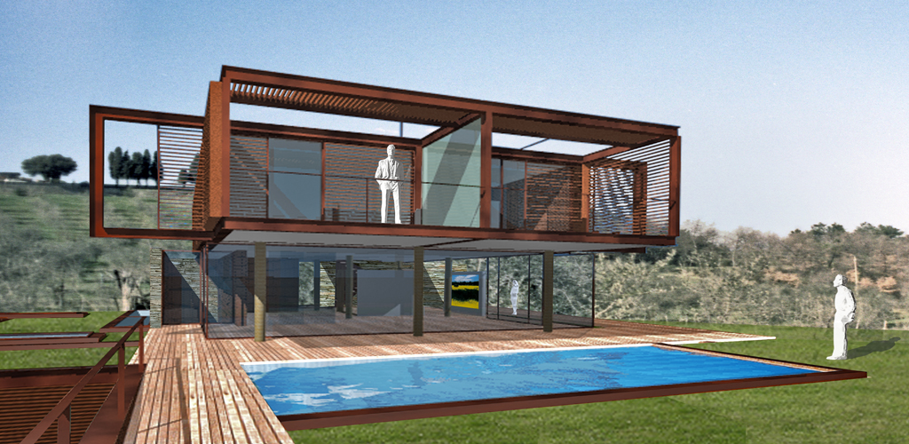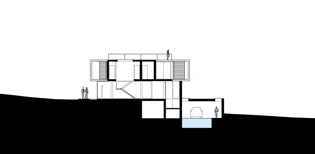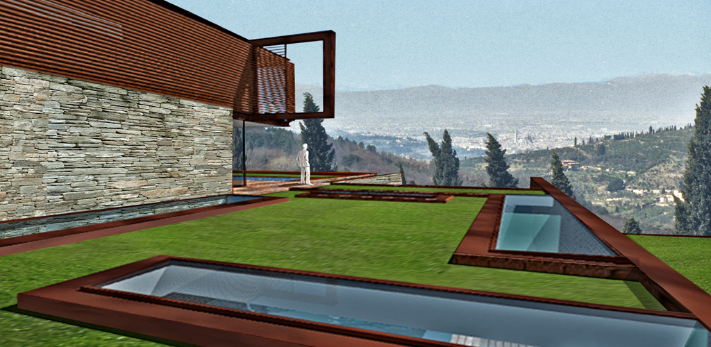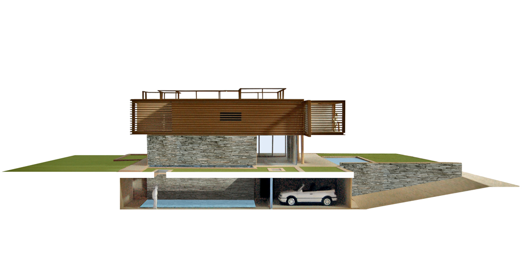 Progetto/ La naturale pendenza del terreno viene modellata attraverso un terrazzamento adibito a giardino pensile, che stabilisce il livello tra zona interrata e fuori terra dell’abitazione. Al piano interrato sono collocati il garage, i locali di servizio, una palestra ed una piscina illuminata naturalmente dall’alto.
