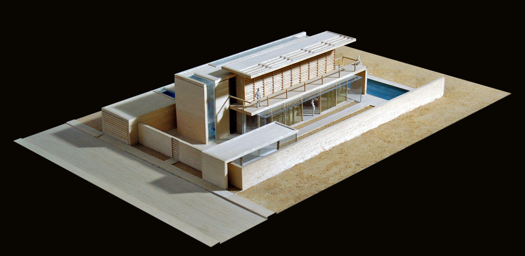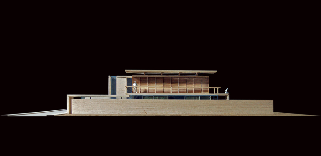 Una parete vetrata sul giardino corre nella sua lunghezza la zona giorno al piano terreno; su questa parete vetrata in alto aggetta la terrazza a servizio delle camere, una sorta di lastra sospesa da cui si apre la vista sulla pianura circostante.