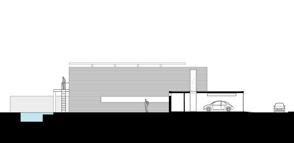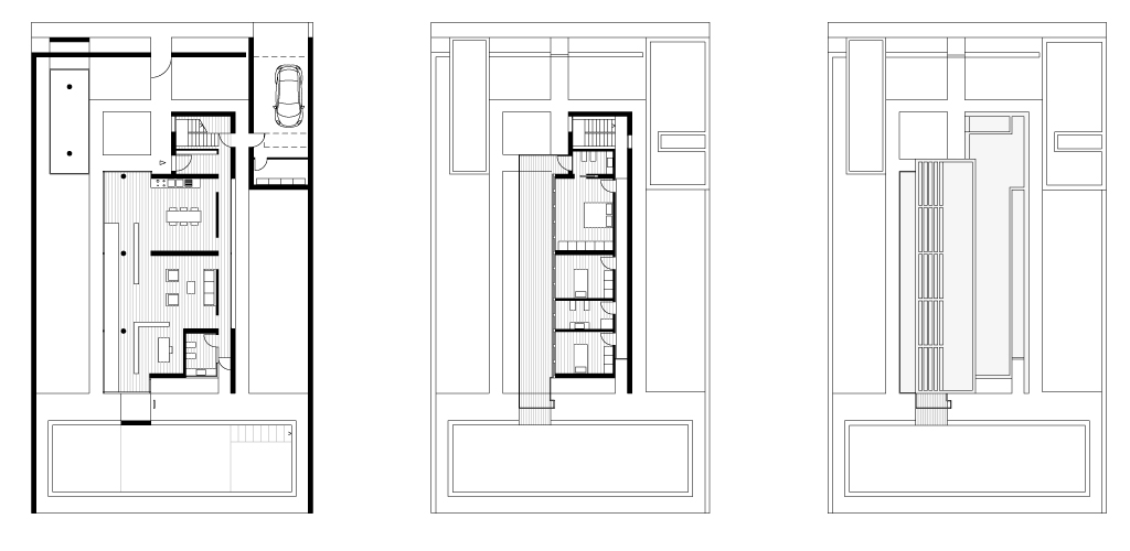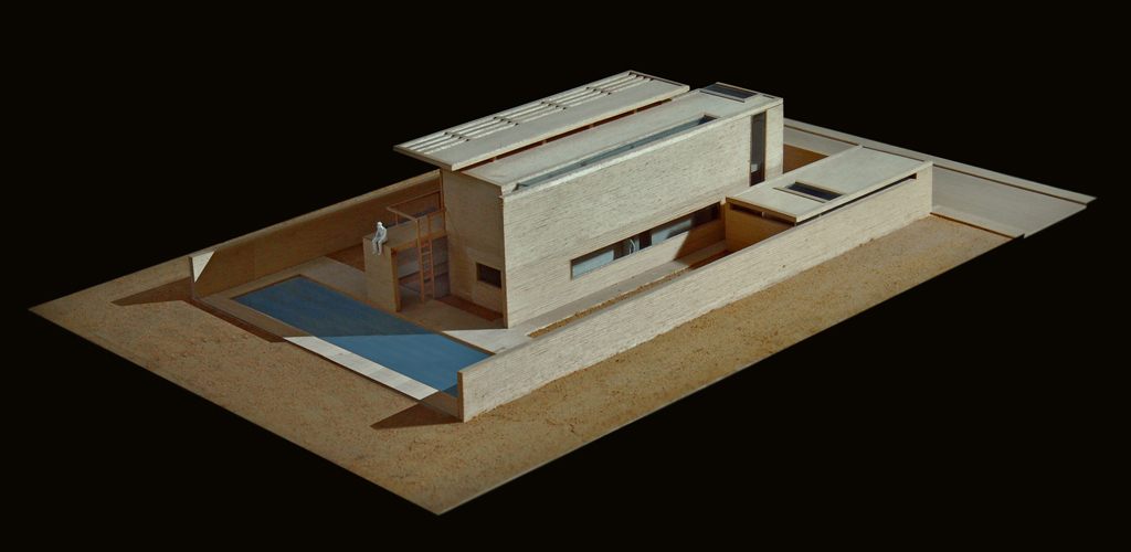 Le funzioni richieste si collocano all’interno di tre volumi paralleli leggermente slittati rispetto al lato strada. Il volume principale dell'abitazione è delimitato da un sistema di lastre perpendicolari che assolvono esigenze strutturali e funzionali. Ai fianchi dell’abitazione un parallelepipedo totalmente chiuso contiene il garage, mentre un altro trasparente è destinato a serra.